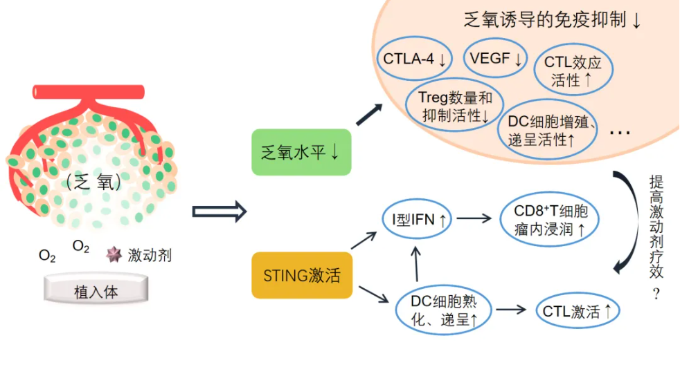 术后联合免疫治疗可有效降低复发和转移率。瘤内干扰素基因刺激因子(STING)的激活是建立肿瘤免疫感知的关键;瘤内乏氧会显著诱导免疫抑制,对STING的促进抗肿瘤T细胞激活和瘤内浸润效应存在明显阻抑,且新发现抗血管生成药物对STING激动剂有协同增效作用。揭示乏氧对STING激活相关抑瘤作用的影响机制,将为激动剂药物开发和术后灶免疫微环境调控提供理论基础。